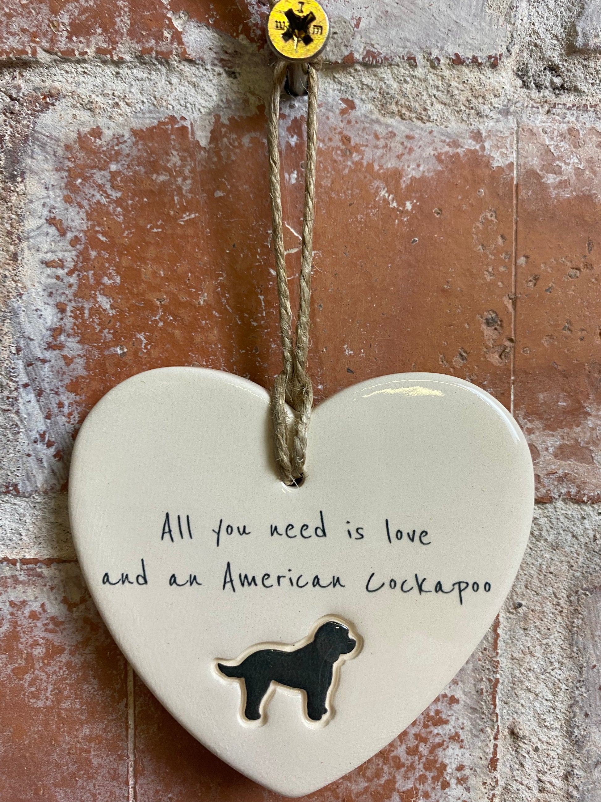 Bring a touch of canine charm to your home or surprise a loved one with this adorable 'All you need is love and an American Cockapoo (American Cocker Spaniel x Poodle cross)' ceramic heart ornament. Designed and Handcrafted in our Northumberland studio using the finest earthenware clay.