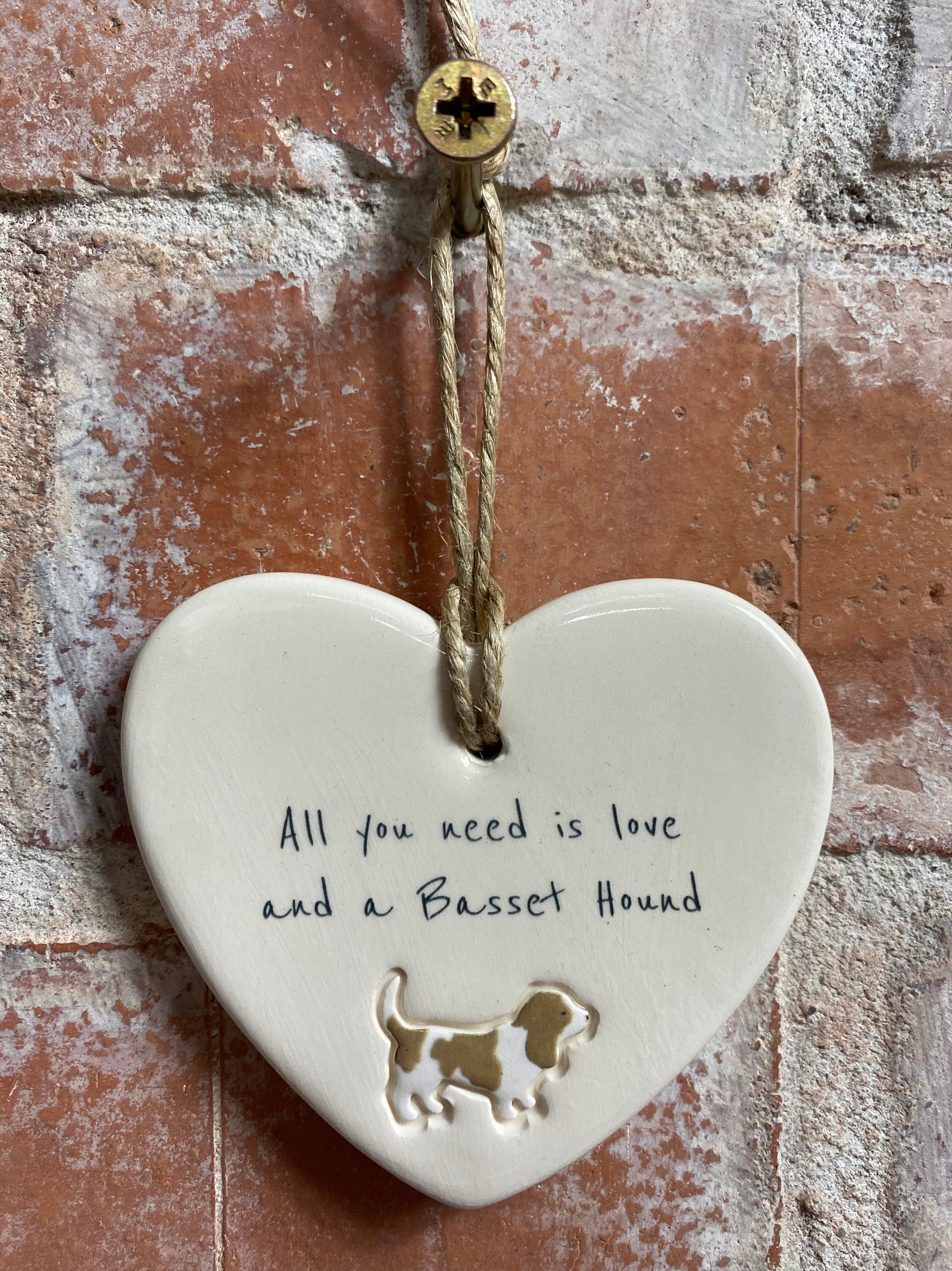 Bring a touch of canine charm to your home or surprise a loved one with this adorable 'All you need is love and a Basset Hound' ceramic heart ornament. Designed and Handcrafted in our Northumberland studio using the finest earthenware clay.
