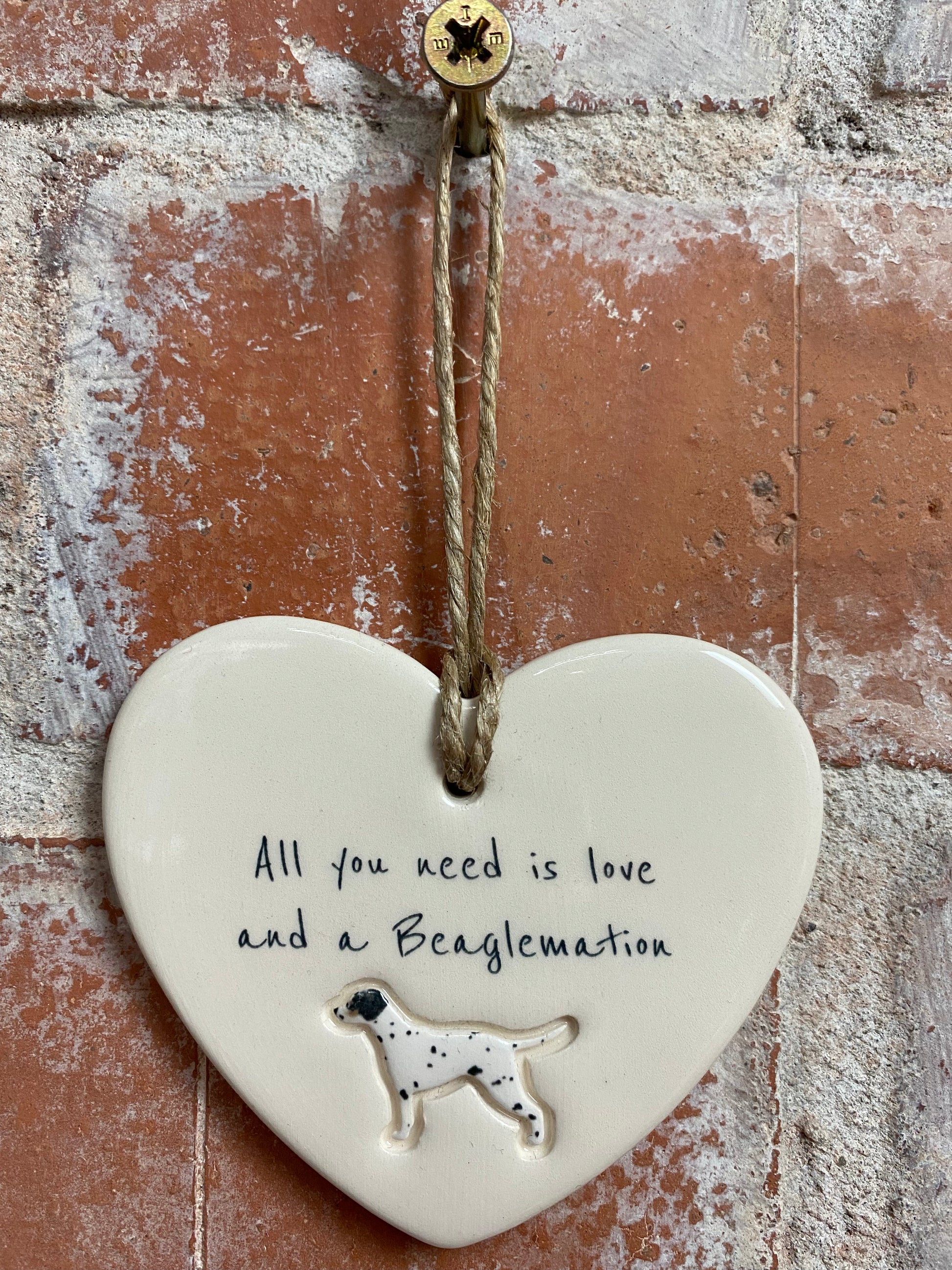 Bring a touch of canine charm to your home or surprise a loved one with this adorable 'All you need is love and a Beaglemation (Beagle x Dalmatian cross)' ceramic heart ornament. Designed and Handcrafted in our Northumberland studio using the finest earthenware clay.