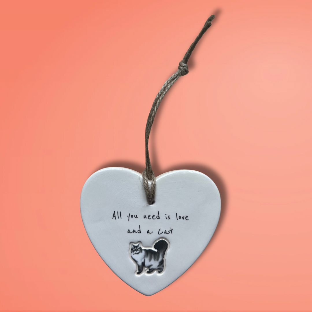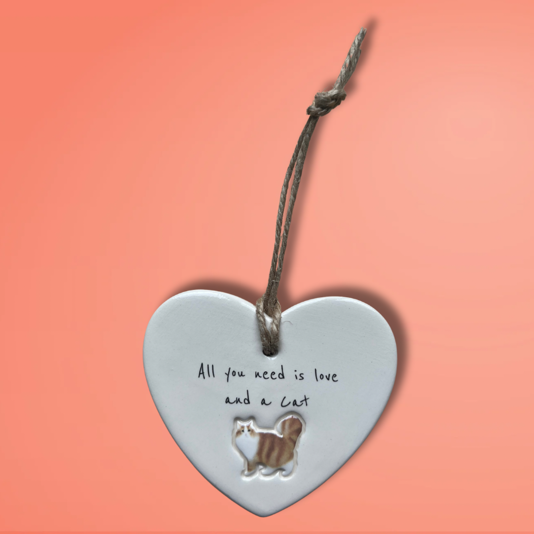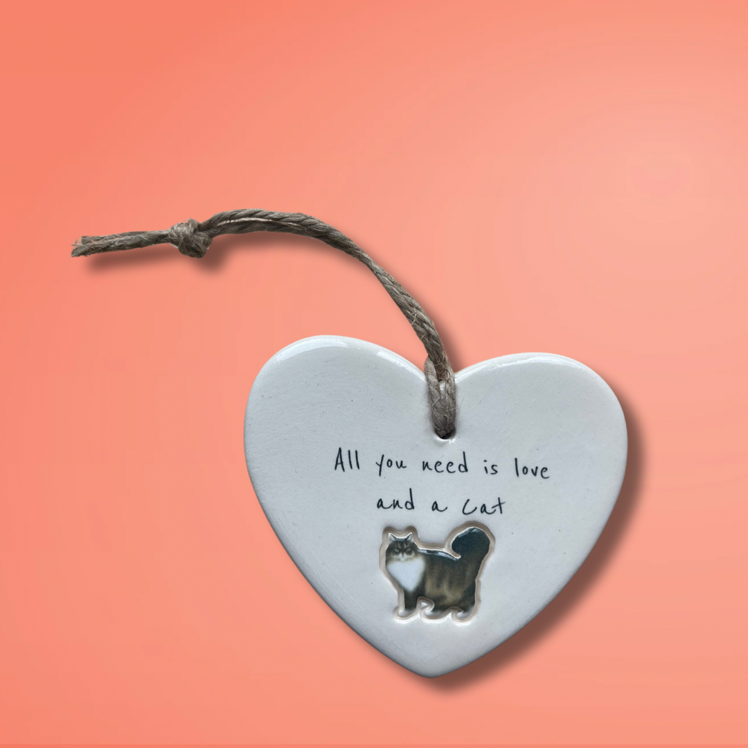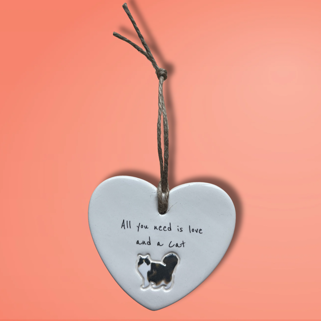 Bring a touch of feline charm to your home or surprise a loved one with this adorable 'All you need is love and a Cat' ceramic heart ornament. Designed and Handcrafted in our Northumberland studio using the finest earthenware clay.