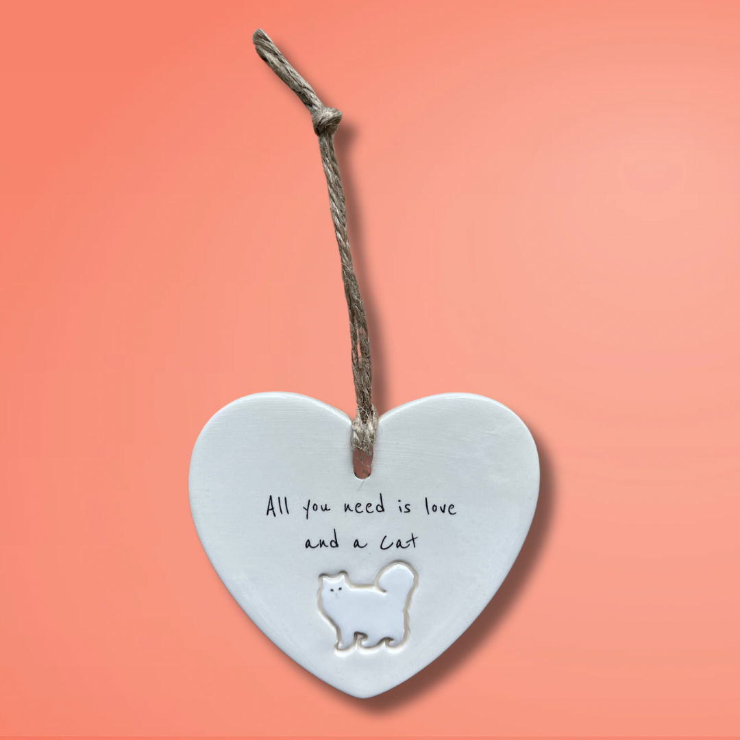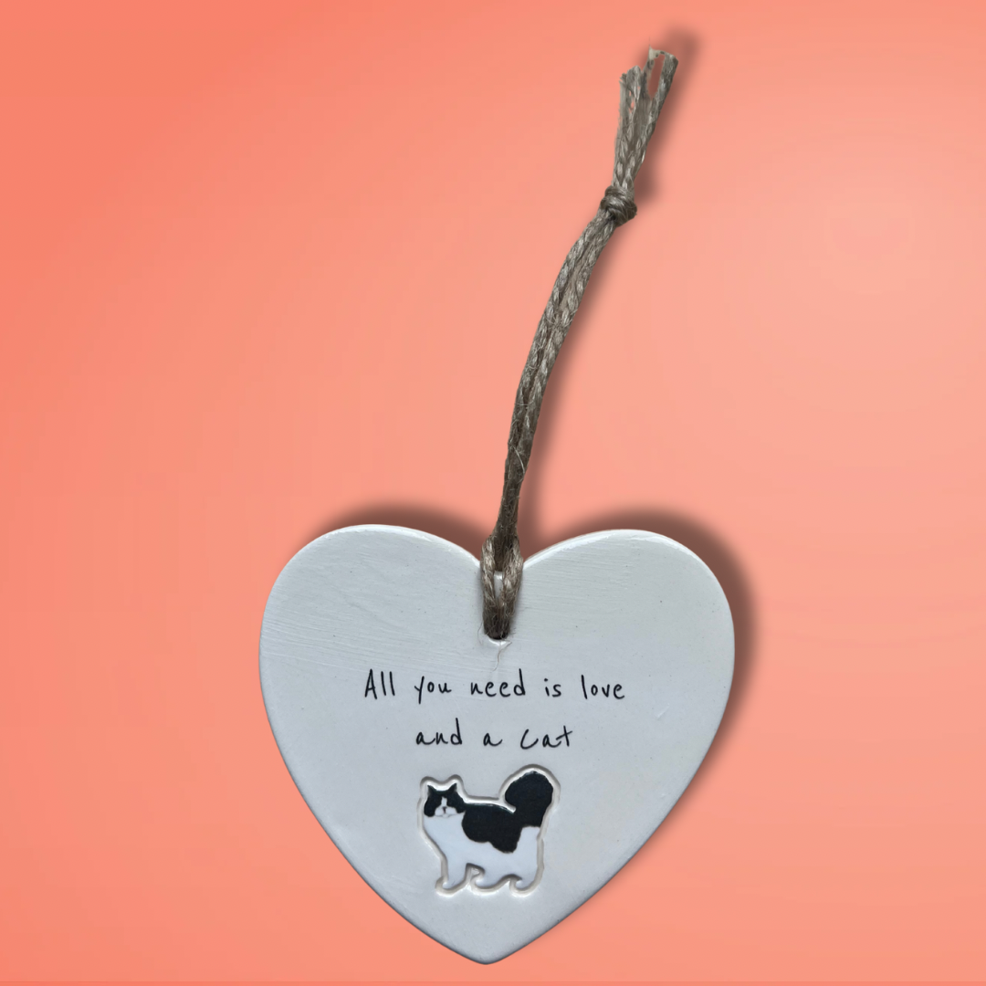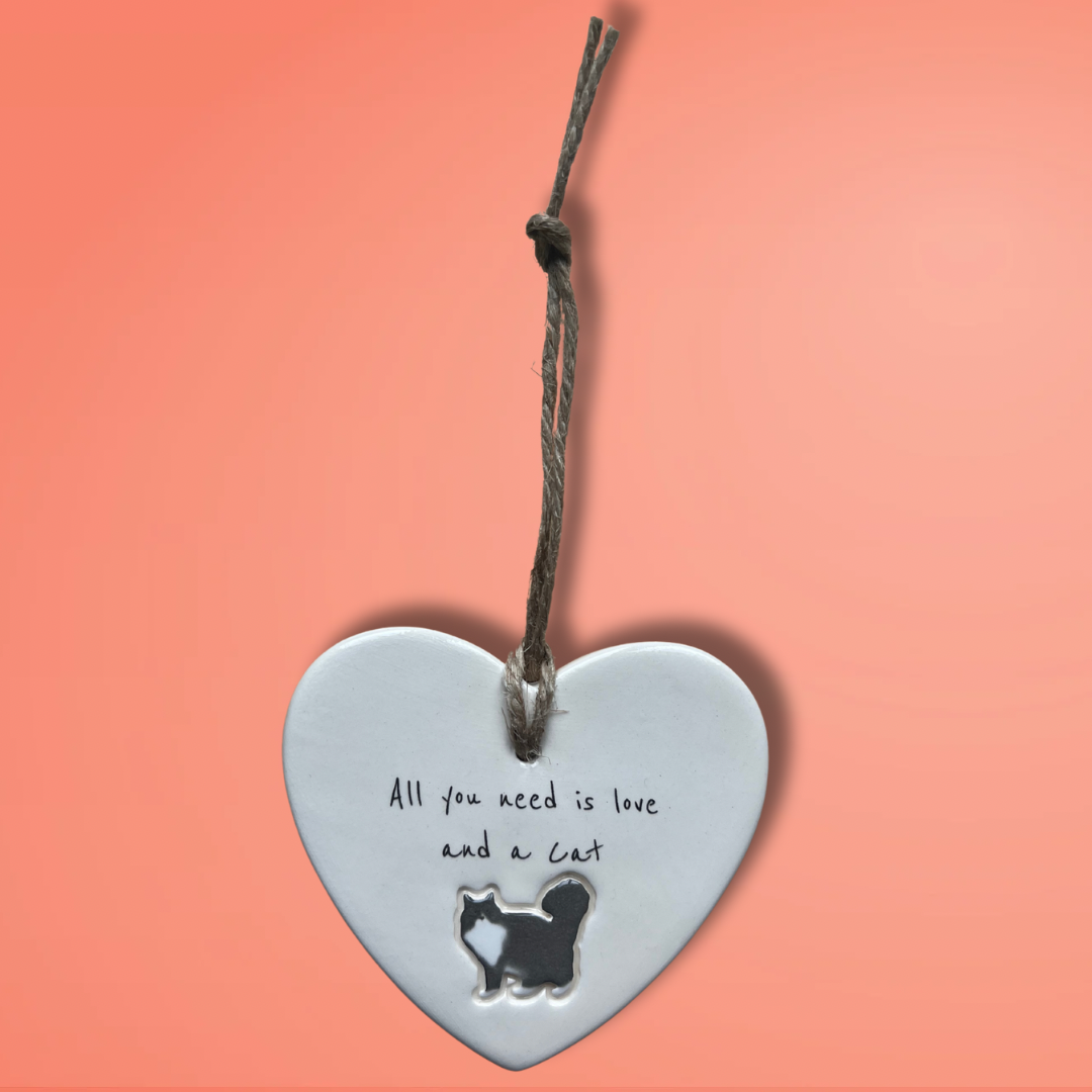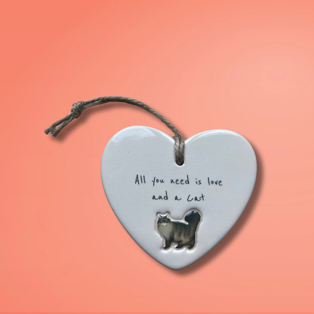 Bring a touch of feline charm to your home or surprise a loved one with this adorable 'All you need is love and a Cat' ceramic heart ornament. Designed and Handcrafted in our Northumberland studio using the finest earthenware clay.