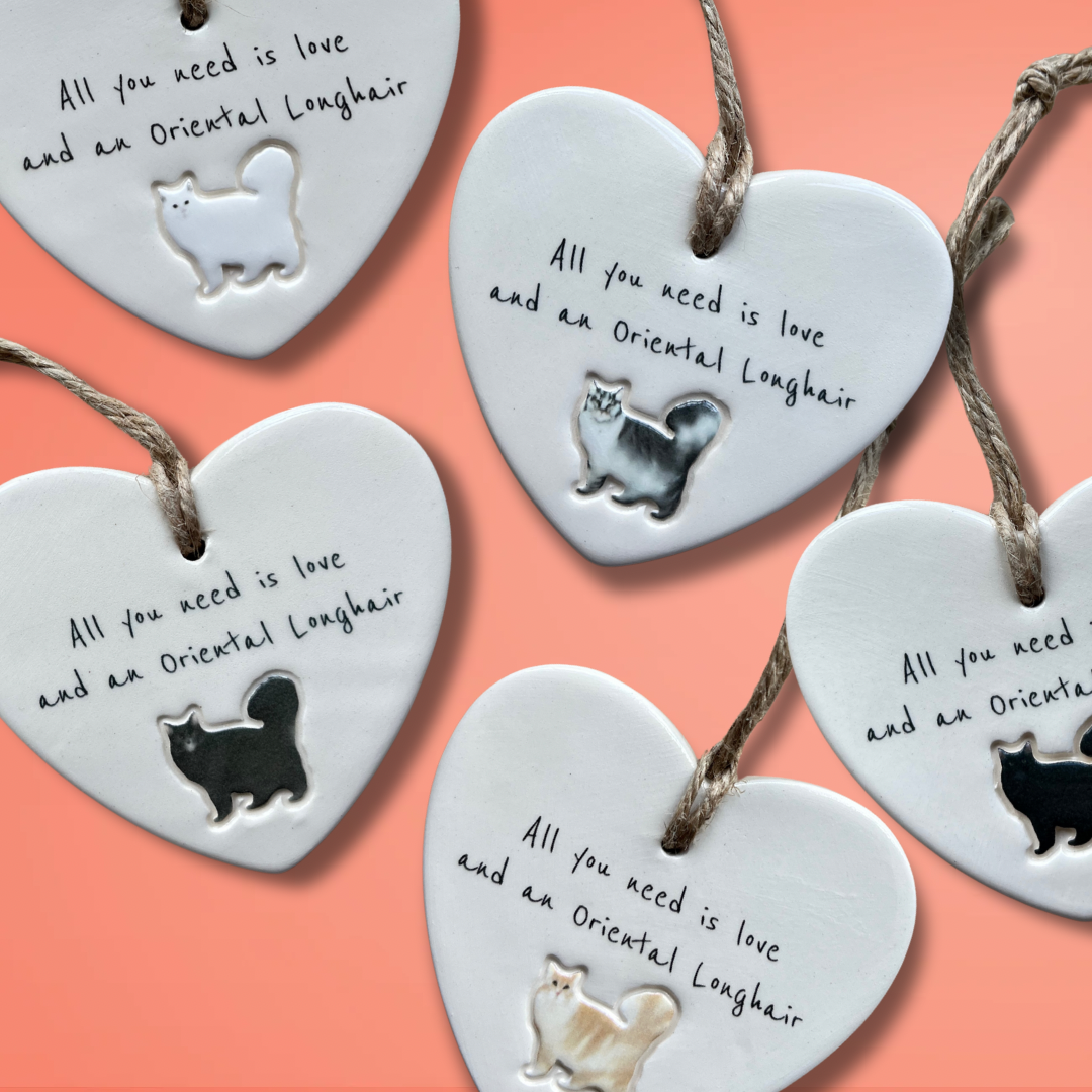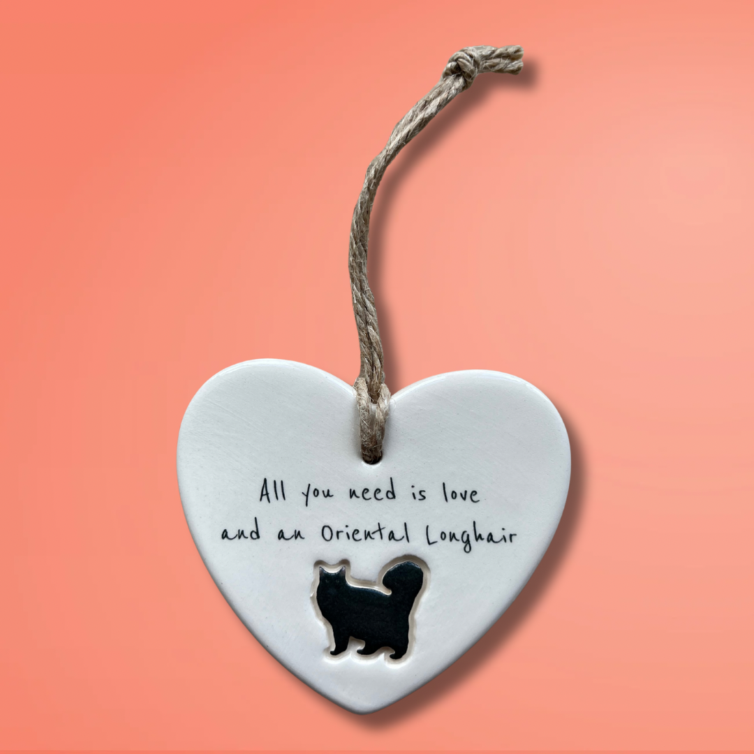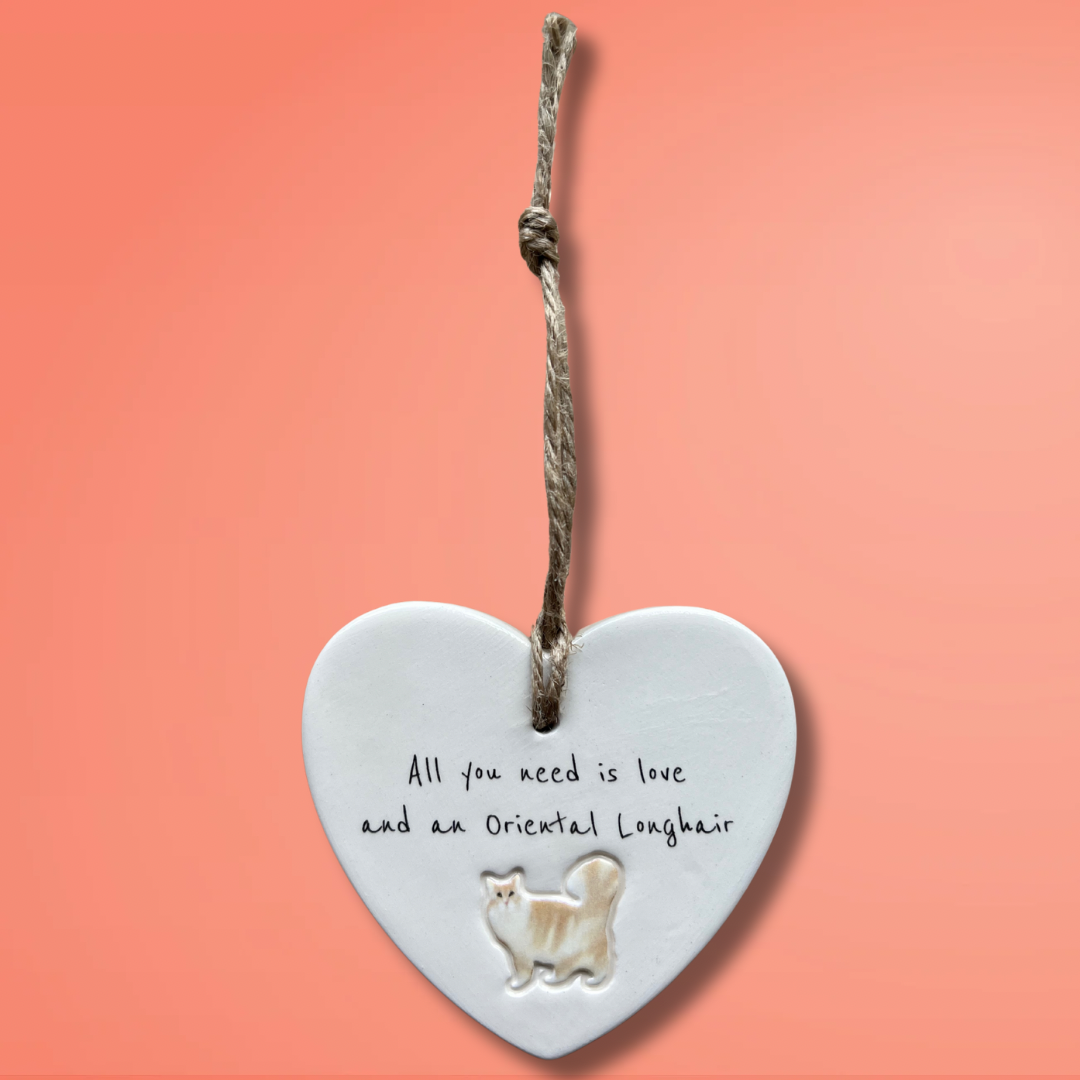 Bring a touch of feline charm to your home or surprise a loved one with this adorable 'All you need is love and an Oriental Longhair' ceramic heart ornament. Designed and Handcrafted in our Northumberland studio using the finest earthenware clay.