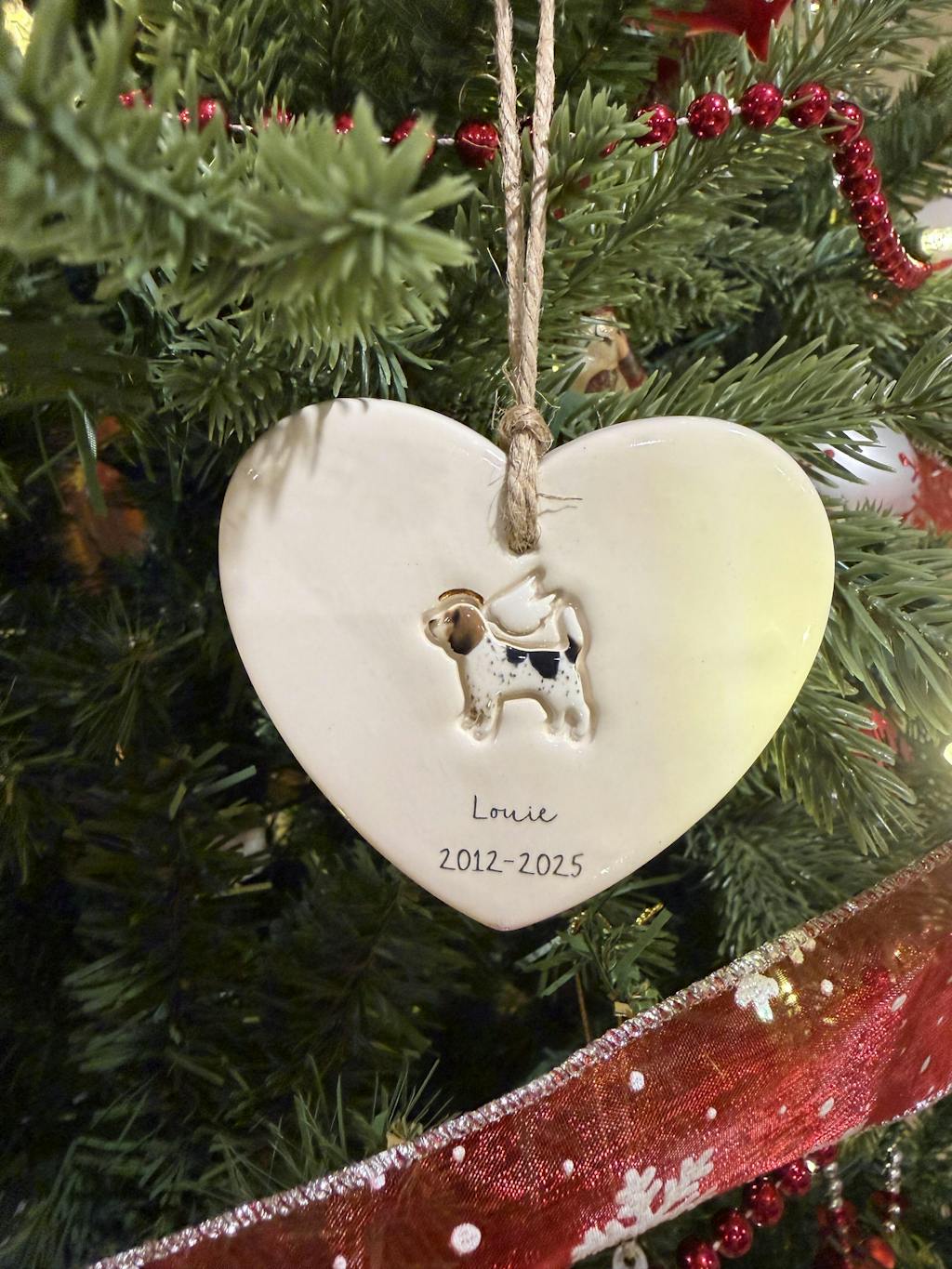 Memorial hanging decoration personalised to your dog. Choose to add wings, a 24k gold lustred halo or a hand painted rainbow to your decoration. Dates can also be added to the bottom of your decoration.