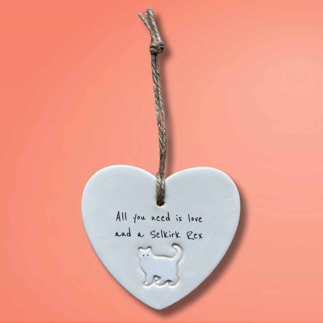 Bring a touch of feline charm to your home or surprise a loved one with this adorable 'All you need is love and a Selkirk Rex' ceramic heart ornament. Designed and Handcrafted in our Northumberland studio using the finest earthenware clay.