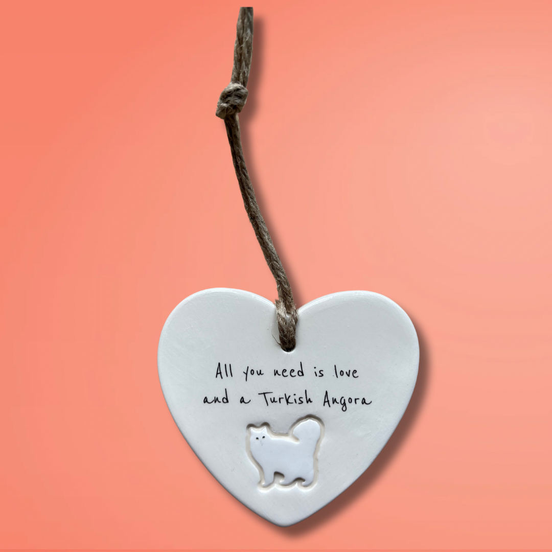 Bring a touch of feline charm to your home or surprise a loved one with this adorable 'All you need is love and a Turkish Angora' ceramic heart ornament. Designed and Handcrafted in our Northumberland studio using the finest earthenware clay.